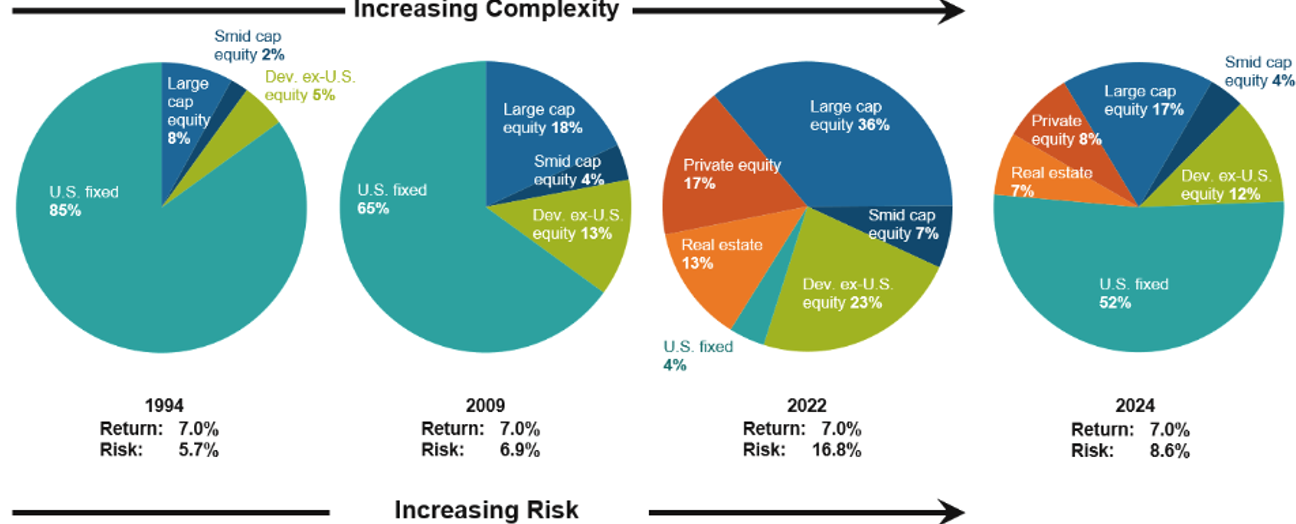 An equally, if not greater, challenge is liquidity. As the title above highlights, Jay Kloepfer, Director of Capital Markets Research at Callan, told II that “Liquidity has become a bigger issue,” He went on to say that “Everybody’s looking under every rock.” Not surprising! Given the migration of assets from public markets to private during the last few decades. The rapid decline in U.S. interest rates certainly contributed to this asset movement, but expectations for “outsized” gains from alternatives also fueled enthusiasm and action. The Callan chart below highlights just how far pension plans have migrated.