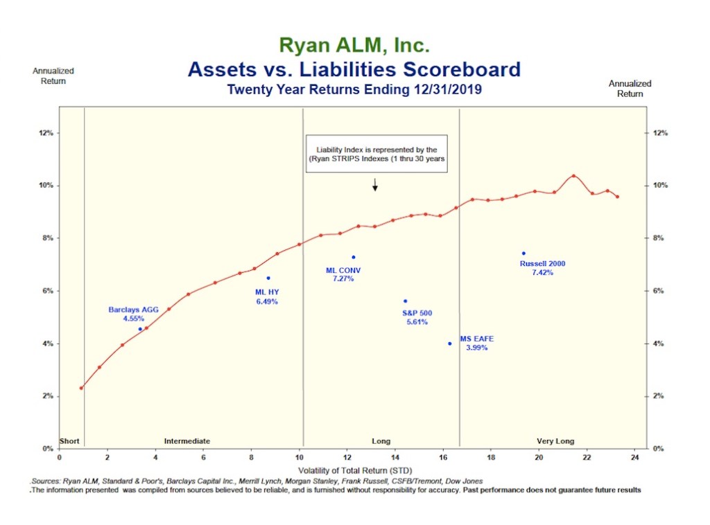 Different accounting rules (IASB, FASB, GASB) permit different discount rates to be used to measure pension liabilities, but the only TRUE measure of pension liabilities is a risk-free rate. The liability index above (red line) uses the Ryan ALM STRIPS index (maturities 1-30 years). The performance of the STRIPS index for the 20-years ending 12/31/19 dwarfs the risk-adjusted returns for many of the major indexes that would represent exposure to the assets in most pension systems.
