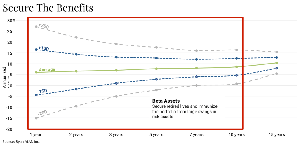 The alpha assets (highlighted by the green box) that presumably have a liquidity premium associated with them now have the time necessary to grow without being disturbed. Furthermore, the alpha bucket can invest in all sorts of assets other than traditional fixed income assets that are too highly correlated to plan liabilities. This process should result in much more stable contribution expenses and funded ratios. As the plan moves through time, it is highly recommended that the sponsor and their consultant contribute the necessary amount to keep the beta bucket defeasing the next 10-years of plan liabilities.