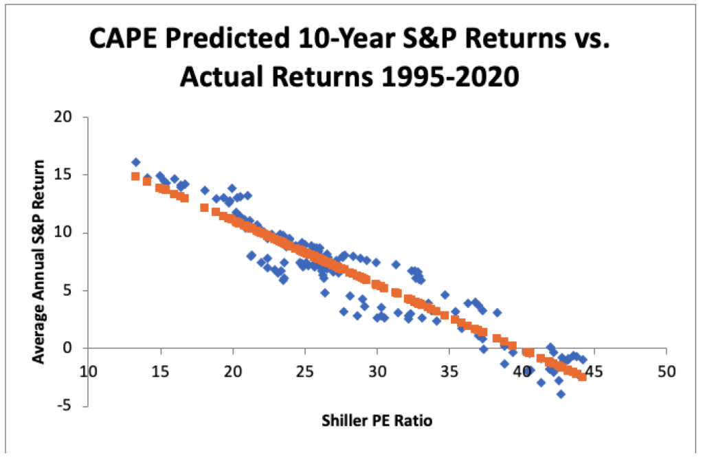 John Authers, Senior Editor at Bloomberg, published this chart in his daily Point of Return newsletter. He got the chart from a Michael Finke article that was published by Advisor Perspectives in July 2020. The chart shows that the CAPE has been incredibly accurate in predicting future 10-year equity returns even without taking bond yields into account. According to Finke, a higher CAPE meant a lower subsequent 10-year return, and vice versa. The R-squared was a phenomenally high 0.9, which explained 90% of stocks’ subsequent performance over a decade and the standard deviation was ONLY 1.37%. This 25-year period has been a roller coaster for markets, as we’ve witnessed an equity bubble (’90s), a credit bubble (’07-’08), two epic bear markets (it feels like we’ve had more than two), and a decade-long bull market that recently went pop!