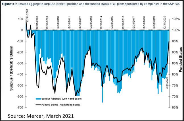 Great funding progress has been made by the average US private pension plan that has benefited during the last 12 months from rising equity values and rising bond yields. As the chart below suggests (thanks, Mercer), the funded status for corporate America now stands at 95%, having risen from a low of 70% in 2012 and 77% just 12-months ago. Given this great progress, now is not the time to sit on one’s laurels. With equity valuations at all-time highs, we believe that corporations would be best served by locking in these tremendous funding gains, even if the goal isn’t to freeze, terminate, and/or engage in a pension risk transfer for your specific pension plan.