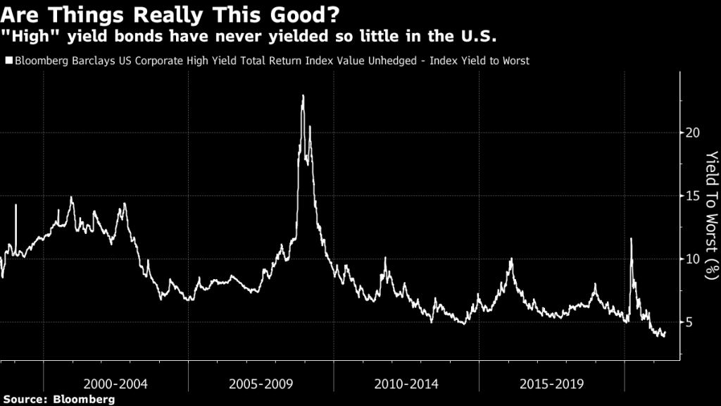 Just this morning, I read an article from Bloomberg that highlighted the narrowing spreads available on high yield debt. In fact, they are so narrow that we are at historic lows! Here is a chart reflecting that fact: