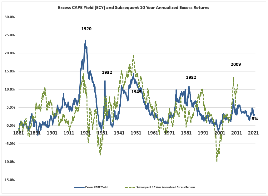 Worse, Robert Shiller’s cyclically adjusted price-earnings multiple, or CAPE, which compares an index’s price to average inflation-adjusted earnings over the previous decade is at a level not seen since 2000, which represented the all-time high. The chart below forecasts the subsequent 10-year return for US equities versus bonds by calculating the excess CAPE yield, or ECY, which is the gap between the CAPE earnings yield (the inverse of the ratio) and the 10-year bond yield. At 3%, the forecasted outperformance of equities to bonds is not nearly enough to get plans to the ROA especially with the 10-year Treasury note currently sitting at a yield of just 1.28%.