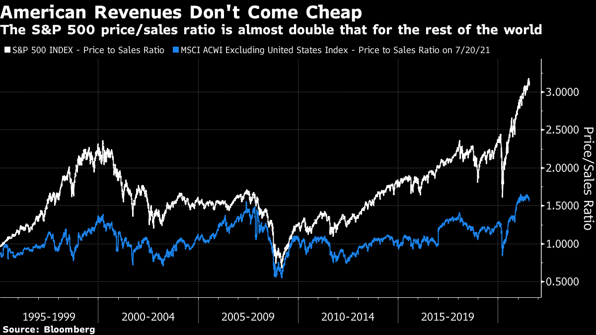 By defeasing liabilities for an extended period of time (8-12 years or more) the asset allocation investing horizon for the legacy assets is dramatically increased allowing for these assets to grow unencumbered as they are no longer a source of liquidity. The S&P 500 has outperformed bonds in 82% of rolling 10-year periods. I like those odds, but the current equity environment may not be a “normal” environment. Two charts produced by Bloomberg provide me with ample angst! The chart titled American Revenues Don’t Come Cheap highlights the US P/S multiple versus the rest of the world and reflects a valuation more than twice as great as the S&P 500/MSCI ACWI. As a point of reference, the US P/S ratio was only 0.9 when the market crashed in October 1987.