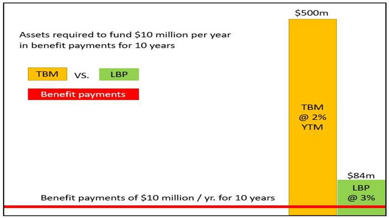 Do you want to improve the efficiency of your asset allocation? Would you like to put fewer assets into fixed income in this low-interest-rate environment? Adopting a cash flow driven investing (CDI) approach will accomplish your objectives. As the example below reflects, traditional bond management (TBM) requires an allocation of $500 million to fund $10 million in annual benefit payments in this 2% interest rate environment. This is very inefficient. By adopting a CDI approach, the fund can accomplish the objective of funding $10 million in benefit payments with ONLY $84 million. The additional $416 million can now be used in other asset classes to support alpha generation.