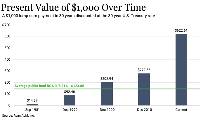 I entered the pension industry in 1981, and interest rates have basically been falling ever since. This has created a huge headwind for defined benefit pension plans, as lower rates not only make it difficult for plans to achieve their return objectives, but it makes it much more expensive to try and defease pension liabilities. As the following chart depicts, it would have cost a plan sponsor only $14.37 to defease a $1,000 30-year liability in September 1981. Today, that same liability costs a plan more than $622! Oh, my!