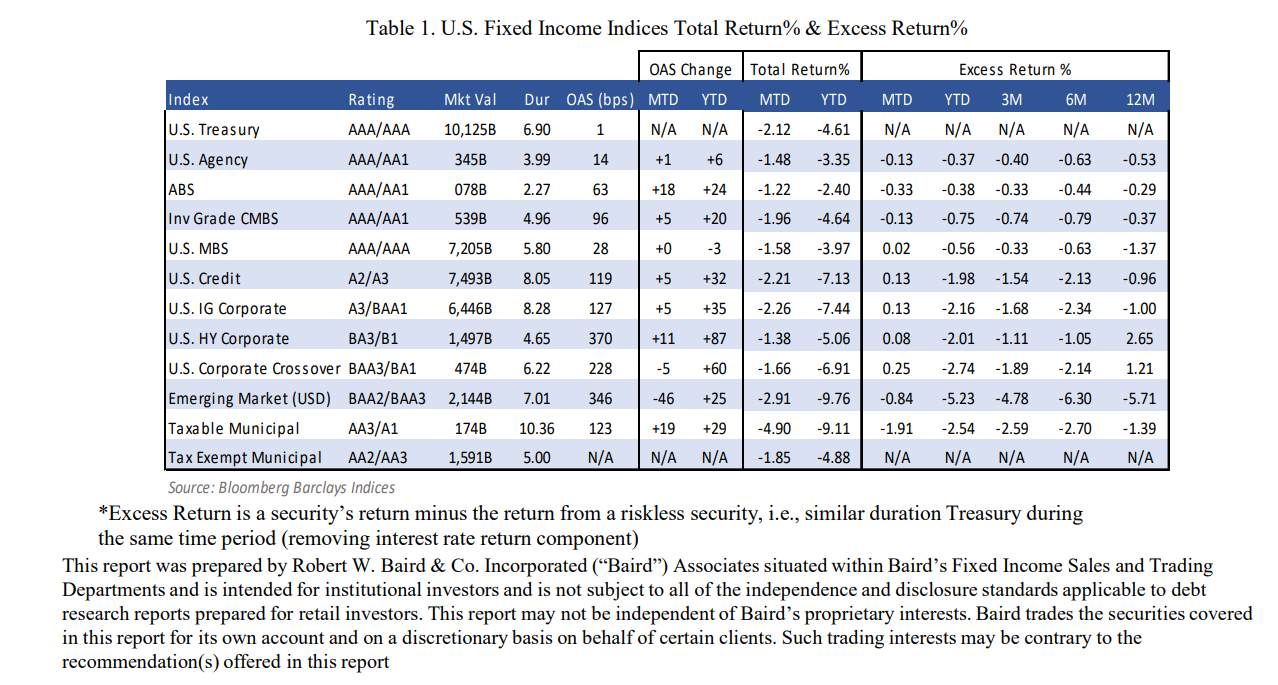 We at Ryan ALM have been suggesting for quite some time that a rising interest rate environment would be quite painful for total return bond programs. Given how early the Fed is in the process, we are a bit surprised by the magnitude of the underperformance by most segments of the US fixed income market year-to-date. The chart below was prepared by Robert W. Baird & Co. It supports our stance that a new day is dawning for US institutional investors who haven’t seen a protracted bear market in fixed income since 1981 and the impact that a lengthy period of sustained interest rate increases would have on fixed income portfolios focused on total return.