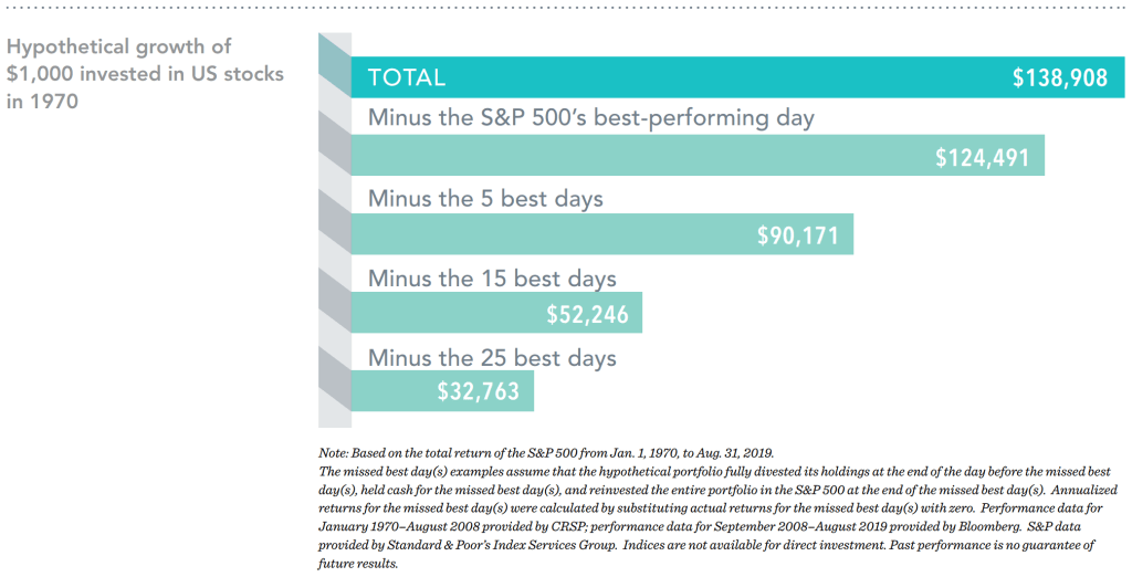 As most investors appreciate, trying to time the markets can prove to be a fool’s game. We know that timing the tops, bottoms, and dips is incredibly challenging and often leads to excessive turnover coupled with transaction costs that can erode potential value-added. As a result, it is best to remain in the equity markets through thick and thin, but does that mean you do nothing? Of course not. The graph below only goes through August 2019, but it dates back to 1970 and clearly demonstrates the impact on the total return to the S&P 500 when missing just a couple of handfuls of trading days.
