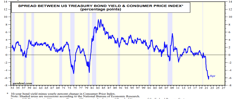 As the graph above depicts, the spread between the US 10-year Treasury bond yield and the consumer price index (CPI) has been significantly positive (i.e. inflation premium) throughout history with a few exceptions. As of April 30, 2022, the negative real return from owing the 10-year Treasury was the greatest in history. May’s inflation # of 8.6% certainly didn’t reduce this unusual relationship. Yet, recent market activity seems to suggest that the Fed’s recent 75 bps increase in the Fed Fund’s Rate may have already started the US economy on a slippery slope to recession. I think that is a bit premature.