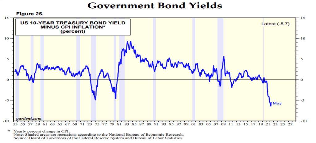 Following the publication of yesterday’s post, I received several good questions including the following: “Have real interest rates (nominal rate minus inflation) ever been below -5%, let alone the current -7%?” It is a terrific question and one that should be on the minds of all investors. The simple and not surprising answer is not since at least 1953. We came close during the turbulent ’70s, but nothing to this extreme. With the most recent rally in Treasuries, the real rate for the US 10-year Treasury Note is – 6.22% as of 8:20 am on August 3, 2022.