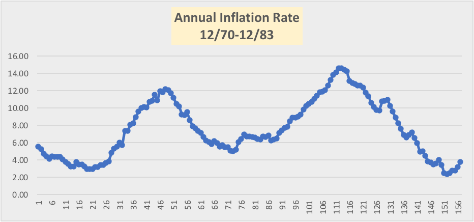 The graph below highlights the path that inflation took during the 1970s into the early ’80s. In August 1972, before Tug McGraw would famously chant “You Gotta Believe” in reference to the NY Mets going from bottom dwellers to the World Series, annual inflation would bottom at 2.95%. It would continue an unabated rise “peaking” 23 months later at 11.54%. Following that month (July 1974), the annual CPI would fall to 10.89% or -0.65% in one month – sound familiar? Did that occurrence represent the beginning of the end for inflation – NO! As August’s CPI quickly rebounded producing a 1.06% increase to an annual rate of 11.95%. Inflation wouldn’t peak until November of 1974 at an annual rate of 12.2%.