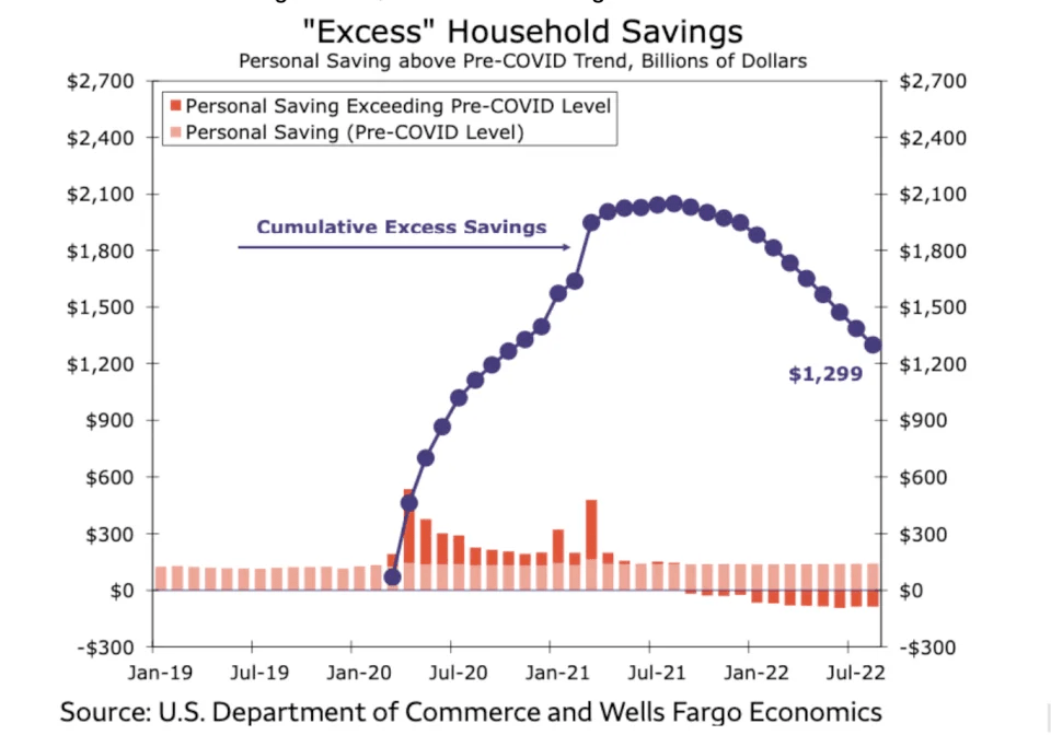 Despite the recent equity and bond market rally, we believe that the Fed still has its work cut out for them. We published a post last week titled, The Fed’s Headwind? in which I wrote about strong employment and rising sentiment combining to create a substantial headwind for the Fed in trying to combat excessive inflation. Here is a wonderful chart that further supports our contention that demand for goods and services will not be thwarted at this level of interest rates given that the American consumer is still flush.