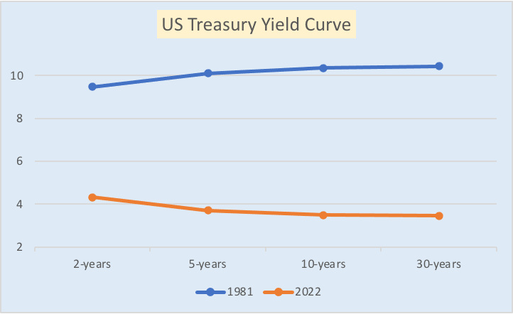 The graph above highlights the US Treasury yield curve for 1981 and 2022. Given similar inflation and GDP data, one would think that US interest rates would be occupying similar levels. But that is far from the case. Market participants today feel that rates have peaked given that inflation appears to be moderating. However, that doesn’t mean that the Fed won’t continue to raise rates in order to achieve a level of “real” rates, which is exactly what Volcker did in the early ’80s. It wasn’t until US interest rates were elevated to a level substantially above the prevailing inflation rate that inflation was finally tamed. Given today’s CPI of 7.7% applying a historic inflation premium (real rate) of 3.1% would push rates above 10% and place them very close to where they were at the end of 1981. Even if inflation fell to 3%, real rates should be at 5% to 6% with an inflation premium of 2% to 3%.