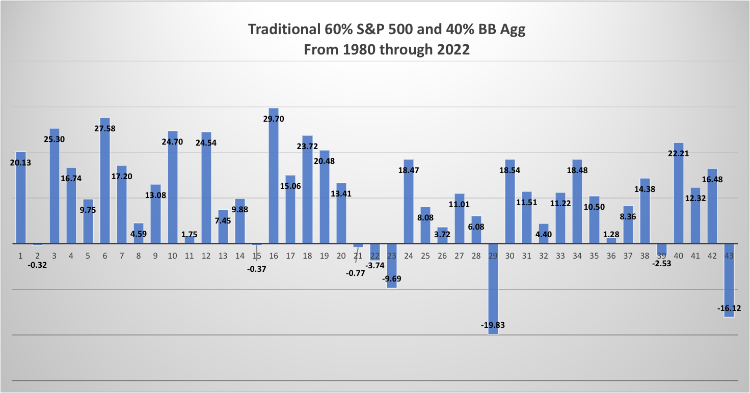 The last 43 years have been an extraordinary time for both bonds and stocks. Including the calendar year 1980, a 60% S&P 500 and 40% BB Aggregate asset allocation produced an incredible 10.44% annualized return, with only 8 down years during that period. This average return far exceeded the average ROA for pension America. The consistency of the equity and fixed income returns is what is most shocking, as there have only been 5 negative calendar years for bonds and 8 negative calendar years for equities. Furthermore, there has only been one year, 2022, in which both indices produced a negative return in the same calendar year. Is it a prelude of things to come or just an anomaly in a continuing extraordinary performance period for US markets?
