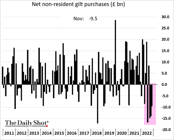 The continuing selling of Gilts (estimated at 38 billion Pounds for the three months from September through November) represents the greatest monthly average sum since the BOE started keeping records of such transactions in 1982. Foreign investors own nearly 30% of the UK debt. This selling pressure comes at a challenging time, as the UK Treasury is facing one of its largest Gilts funding needs in the next financial year at nearly $300 billion, while the BOE simultaneously tries to unwind more than 40 billion Pounds in Gilts under its October QE program. I’m not yet sure how this impacts the UK pension system. Have they sufficiently unwound highly levered LDI duration strategies utilizing derivatives or are they continuing to sit with those positions? Perhaps one or more of our readers could share some insights with us based on specific knowledge of the current UK pension market.