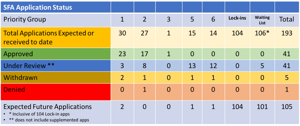 The current activity includes 5 applications from non-Priority Group members and 36 pension plans that were among the initial 6 priority groups. During the previous week, there were no applications approved or denied. No SFA grant money was wired out either. However, there was an application filed. Priority Group 5 member, UFCW Local One Pension Plan, filed a revised application seeking $764.4 million in SFA grant money for its 19,177 participants. The PBGC has until 8/16/23 to act on the application.