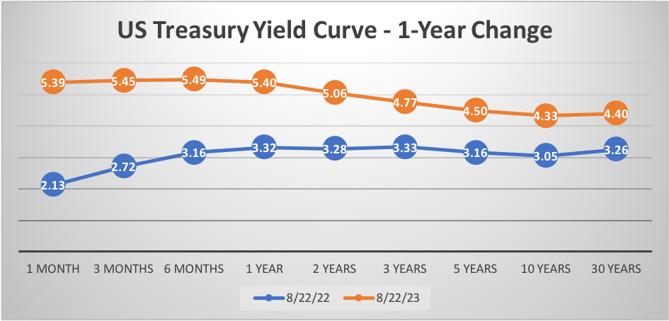 We didn’t have to wait until September, as Fed Chairman Powell delivered his speech in Jackson Hole, WY. Declares once again his commitment to getting inflation down to 2%. US Treasury yields rising across the curve.