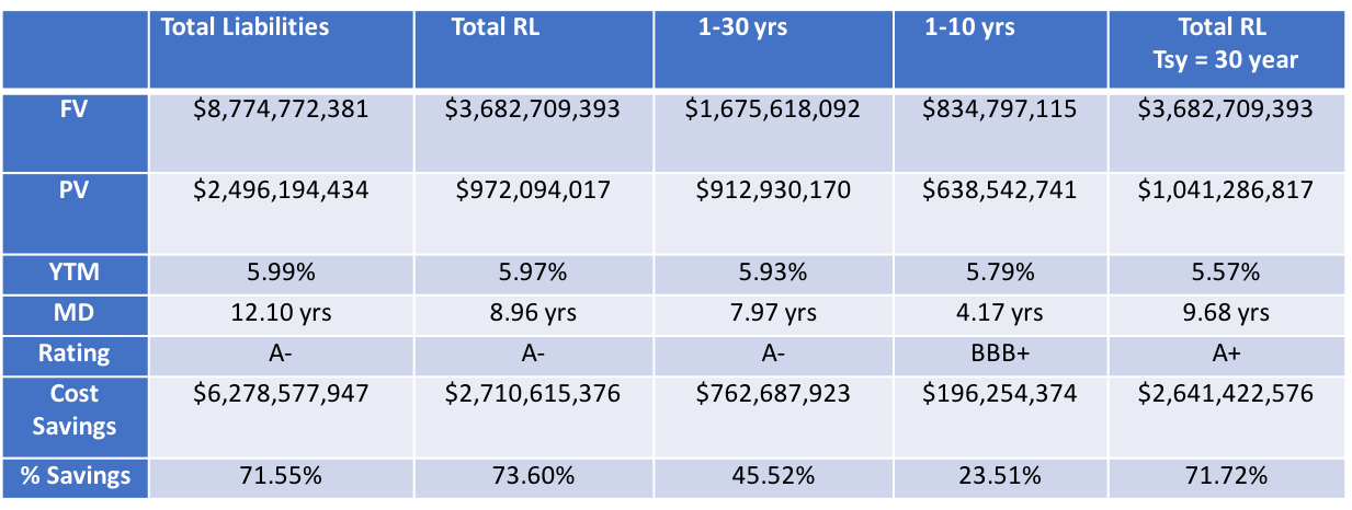 As the table below highlights, we can defease all of the RLL at a present value (PV) cost of $972 million. This equates to a cost reduction of 73.6% or $2.7 billion. Yes, some will say that the “savings” are nothing more than the time value of money. However, when one defeases pension liabilities, the “savings” are realized immediately and generated with little risk through an investment grade bond portfolio, unlike a traditional asset allocation and the volatility associated with that process. Furthermore, we can tell you what the return will be on the portfolio on day 1! Is there any other strategy that can do that?