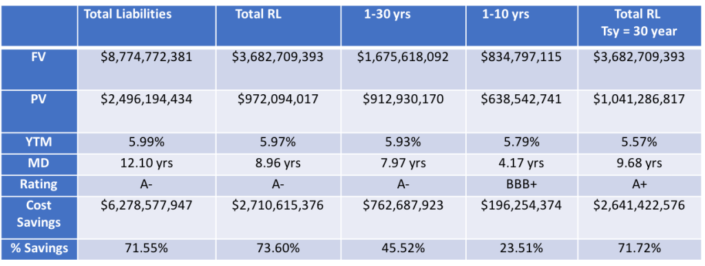 If securing all of the RLL is not a desired goal at this time, we can defease any series of years that you desire. Again, in the table below, we have defeased liabilities for 10- and 30-years. The cost savings reduction is quite meaningful. The cost savings will always be more robust the longer the maturity of the program. Bond math is very straightforward: the longer the maturity and higher the yield, the lower the cost.