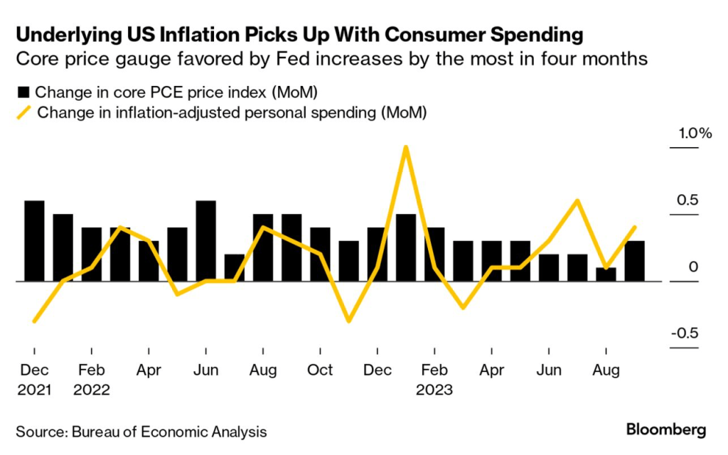 The FOMC has paused additional increases since July, but that doesn’t necessarily mean that they have been victorious in their quest to defeat inflation. If 2% is the Fed’s line in the sand, they still have quite a bit to accomplish. There has certainly been progress made since last summer, but not enough at this time to feel confident that future increases in the FOMC’s FFR aren’t necessary. Recent economic data belie the broad expectations of a US recession. Furthermore, the Fed’s “preferred” measure of inflation, the core personal consumption expenditures (PCE) price index, which strips out the volatile food and energy components, rose 0.3% in September, according to a new Bureau of Economic Analysis report. Please note that the Food & Energy components rose by 6.7% annualized in September.