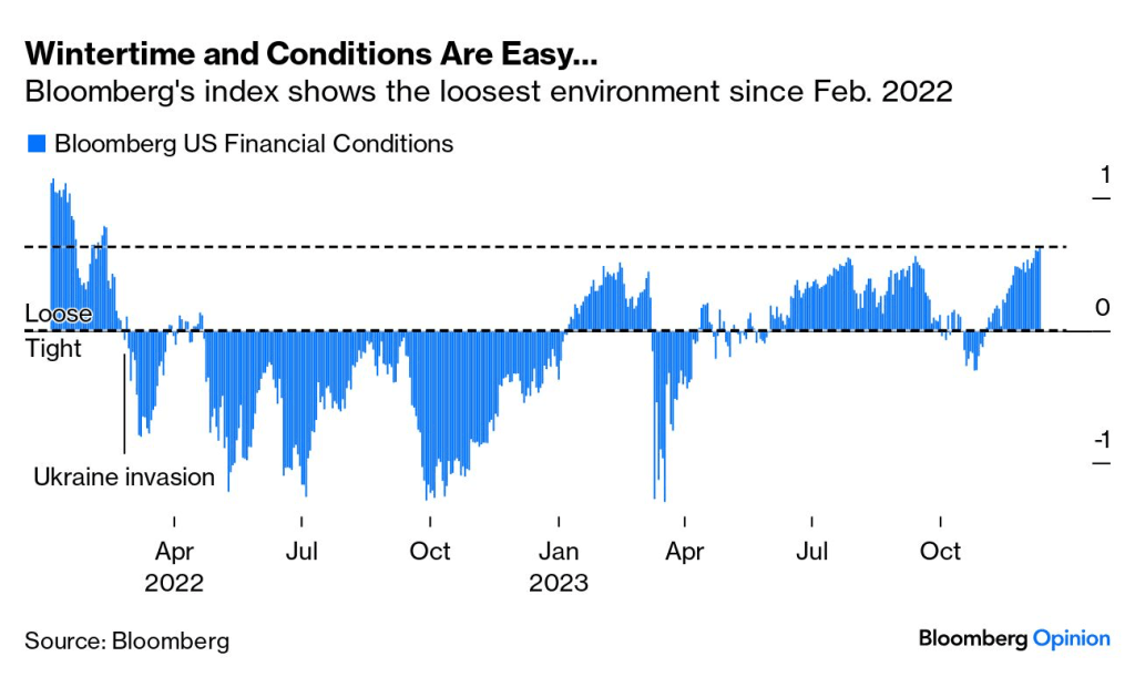 What may make the Fed’s job more challenging is the fact that the investing community feels that the Fed’s task has been achieved. It was only about 6 weeks ago that the Treasury curve had yields for the key rates at or above 5%. Today the 10-year Treasury note’s yield is 84 bps lower. The impact of falling Treasury yields and risk on trades has made the access to financing much easier. As the graph below highlights, conditions haven’t been this easy since February 2022.