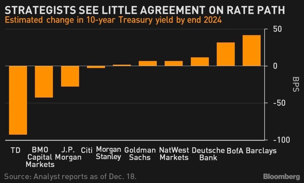 Was the reaction to the Fed’s third consecutive meeting pause an overreaction? Is the expectation among investors that the Fed’s next move must be to reduce rates a reflection of living with 40-years of Fed easing anytime that there was a wobble in the investing world? Has the potential Fed easing in 2024 been fully priced in already and what might that mean for bond investors as we go through 2024 and beyond? Are you confused yet? Well, that isn’t surprising since most of us have never been through a protracted secular interest rate rise such as the one experienced from 1953 to early 1982. Well, as the chart below highlights, you aren’t the only one who is uncertain as to where US interest rates might be at the end of 2024. Thanks to the following Bloomberg chart that my college Steve DeVito (Ryan ALM’s Head trader) grabbed from LinkedIn.com, it seems like strategists on Wall Street are also at odds with one another as to where rates are going.