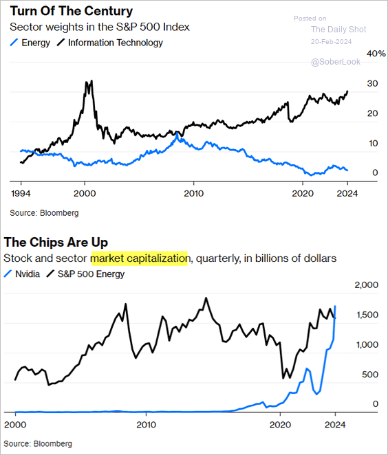As the above graphs highlight, we are once again witnessing tremendous exposure within the S&P 500 to information processing. The last time that this sector’s weight eclipsed 30% of the index was just before the Tech bubble burst. Again, it is different. Companies within this sector have great businesses and actual earnings but do they have valuations that can justify the current stock prices? Perhaps we’ll find out more this afternoon when Nvidia announces their latest results.