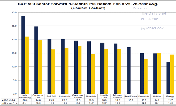 In any case, it seems a bit shocking to me that Nvidia’s capitalization is now greater than that of the entire S&P 500 Energy sector. Furthermore, only Energy and Utilities have a forward P/E multiple that resides below the average for the last 25-years as reflected in this FactSet chart.