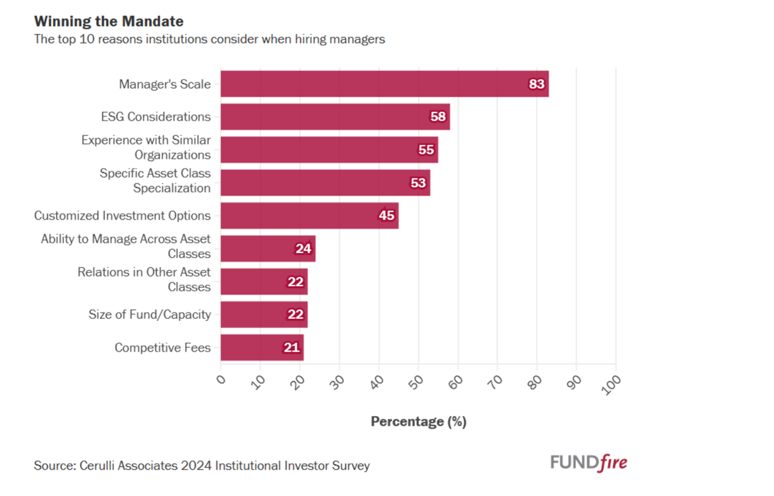 Based on my experience, having expertise in a particular investment discipline has always been the key to success. Another important data point in producing the desired outcomes is knowing when your AUMs have exceeded the natural capacity of that strategy. Yet, there seems to be this belief that size matters (scale). According to a recent article in FundFire, participants in the survey overwhelmingly indicated that scale was the most important characteristic in their hiring decision. Incredibly, specific asset class specialization was down at #4 with only 53% of respondents believing that was an important attribute. Seriously?