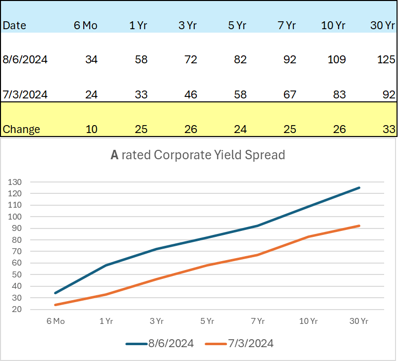 As the data above reveals, corporate spreads have widened quite a bit relative to Treasuries. For a BBB rated corporate with a 10-year maturity, the current yield spread would be about 146 basis points above the 10-year Treasury or about 5.4% based on today’s market action. That remains a very attractive rate for a pension plan looking to take risk off the table by securing future benefit payments through our defeasement strategy. Fortunately, the widening of yield spreads hasn’t been only found in BBBs, as yields for both A and AA bonds have also expanded relative to the comparable Treasury.