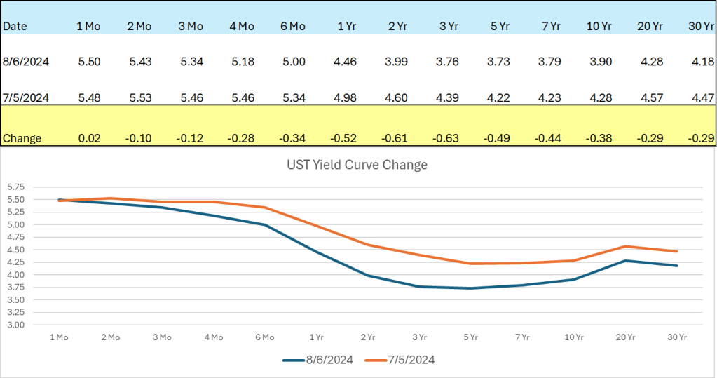The US bond market has been extremely active with significant flows moving into bonds. In particular, US Treasuries of varying maturities. This has resulted in a significant move down in yields across the yield curve, but primarily in Treasury Notes with maturities 1-5 years, where rates have declined from 49 to 63 bps.