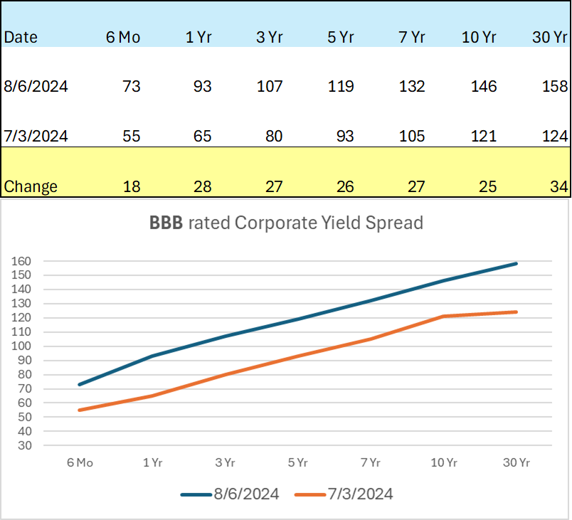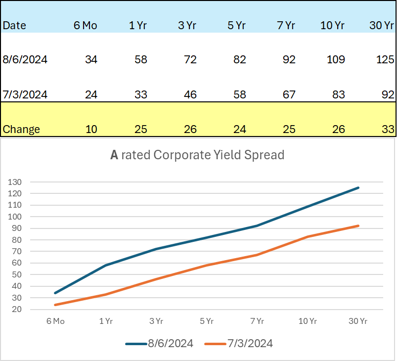 As the data above reveals, corporate spreads have widened quite a bit relative to Treasuries. For a BBB rated corporate with a 10-year maturity, the current yield spread would be about 146 basis points above the 10-year Treasury or about 5.4% based on today’s market action. That remains a very attractive rate for a pension plan looking to take risk off the table by securing future benefit payments through our defeasement strategy. Fortunately, the widening of yield spreads hasn’t been only found in BBBs, as yields for both A and AA bonds have also expanded relative to the comparable Treasury.