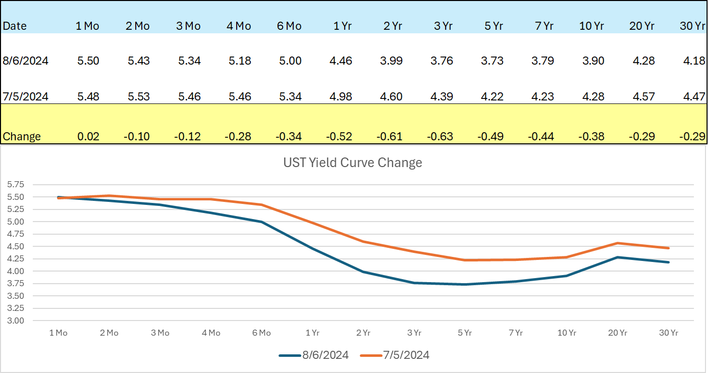 The US bond market has been extremely active with significant flows moving into bonds. In particular, US Treasuries of varying maturities. This has resulted in a significant move down in yields across the yield curve, but primarily in Treasury Notes with maturities 1-5 years, where rates have declined from 49 to 63 bps.