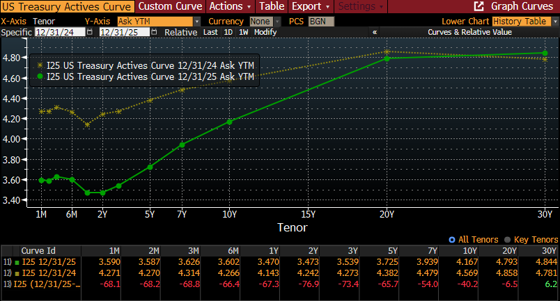 Despite FOMC action that reduced the Fed Funds Rate from 4.25%-4.50% to 3.5%-3.75%, the yield on the U.S. 30-year Treasury bond was higher at 12/31/25 (4.85%) than at year-end 2024 (4.79%). The Treasury yield curve became much steeper during the year as the spread between 2-year notes and 30-year bonds grew from 0.54% to 1.37%. Given the steepness in the YC, using a cash flow matching vertical slice for a portion of the pension plan’s liabilities will provide far greater cost reduction than a 100% CFM for a shorter period. Just something to consider as you look to remove some risk from your DB plan’s AA.