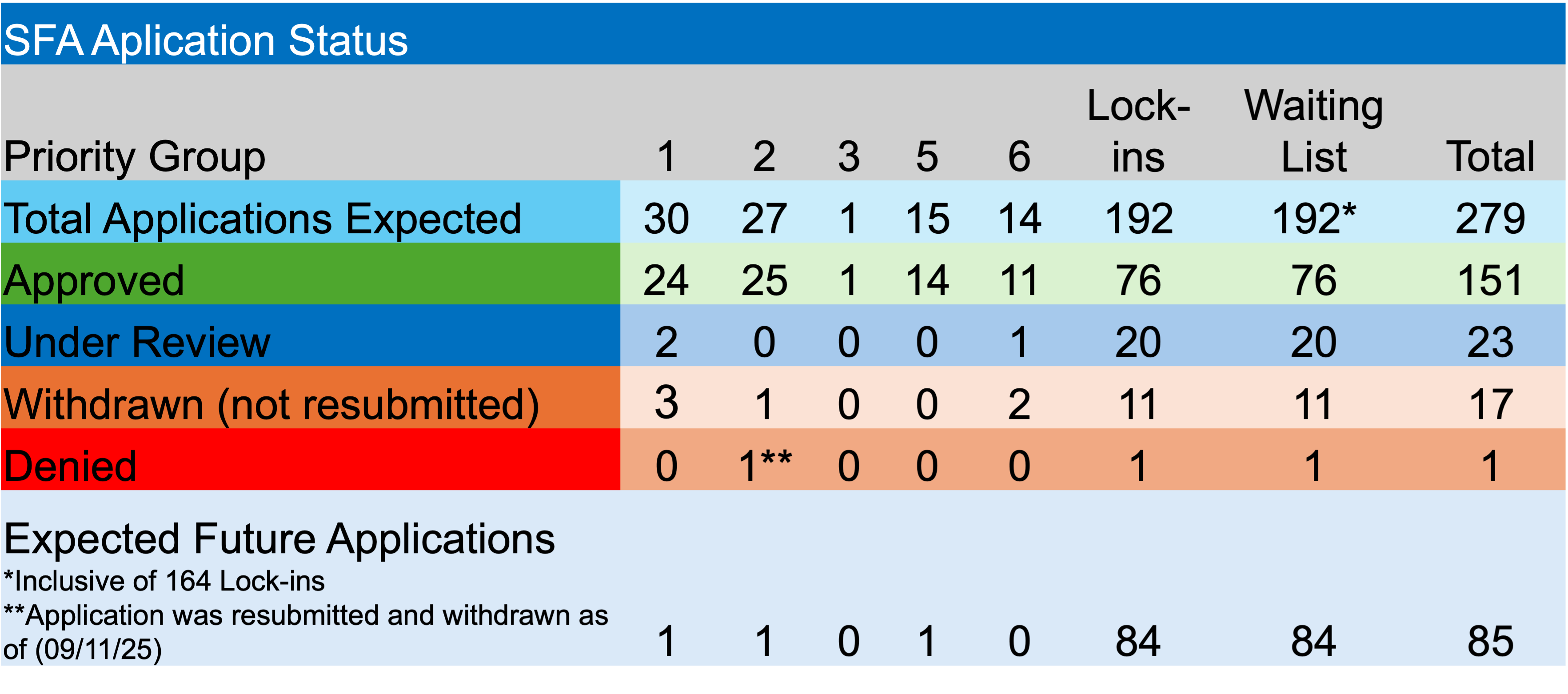 Regarding non-mass withdrawal applicants, the previous week saw no applications submitted, none approved, no plans being denied due to ineligibility, and no plans asked to rebate a portion of the SFA received due to census issues. However, there was one plan that withdrew its initial application. Teamsters Industrial Employees Pension Plan, a non-priority group member, is seeking $27.4 million in SFA for the 1,888 plan participants. They will have the opportunity to resubmit an application until 12/31/26.