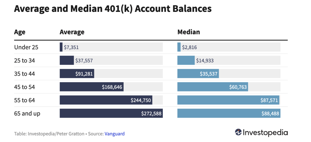 Regrettably, there was once again NO mention of the median account balance, which we know is rather anemic. Can the providers of 401(k)s, IRAs, and 403(b)s, please stop highlighting average accounts which are clearly skewed by the much larger balances of a few participants? According to an analysis provided earlier this year by Investopedia, median account balances at Vanguard were dramatically lower than average accounts. As the chart below highlights, there was not a median balance within 40% of the average balance. In fact, those 65-years-old and up had an account balance at 32% of the average balance. I can’t imagine that this ratio would be much different at Fidelity or any other provider of defined contribution accounts.