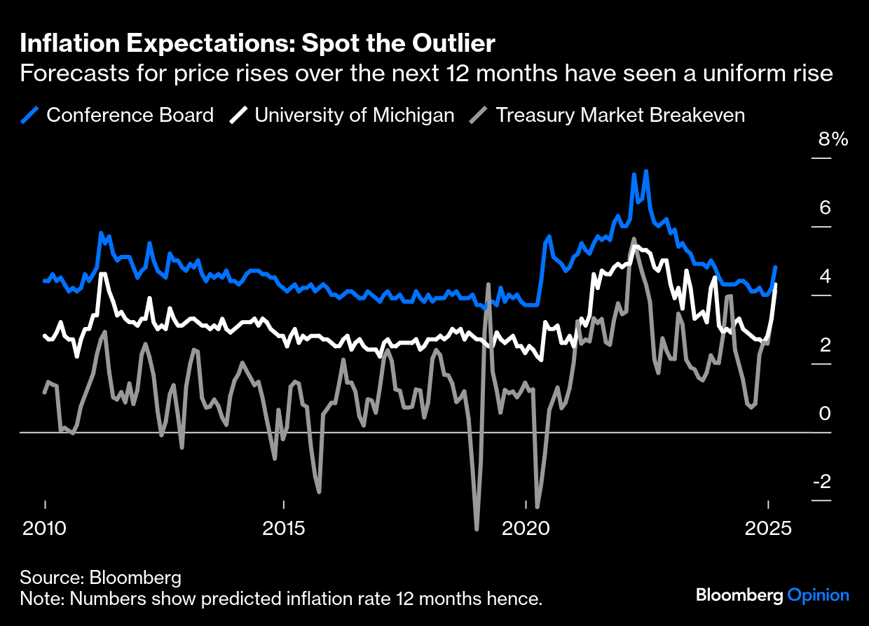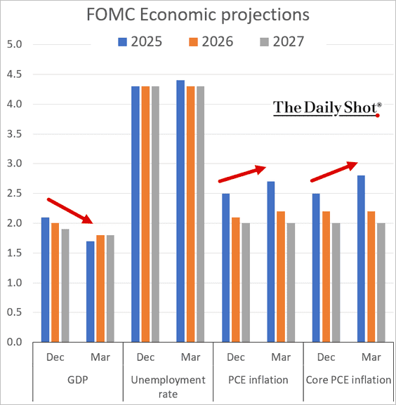 According to the graph above, the FOMC is beginning to worry about stagflation reappearing in our current economy, as they reduced the expectations for GDP growth (the Atlanta Fed’s GDPNow model has Q1’25 growth at -1.8%), while simultaneously forecasting the likelihood of rising inflation. Not good. If you think that the FOMC is being overly cautious, look at the recent inflation forecasts from several other entities. Seems like a pattern to me.