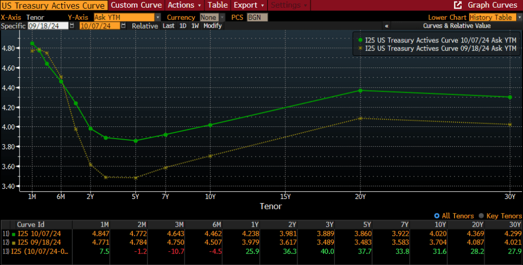 Well, as we all know, the US Federal Reserve slashed the Fed Funds Rate by 0.5% on September 18th (4.75%-5.0%). Did this action lead bond investors to plow additional assets into the market driving rates further down? NO! In fact, since the Fed’s initial rate cut, Treasury yields have risen across the yield curve with the exceptions being ultra-short Treasury bills. Furthermore, the yield curve is positively sloping from 5s to 20s.